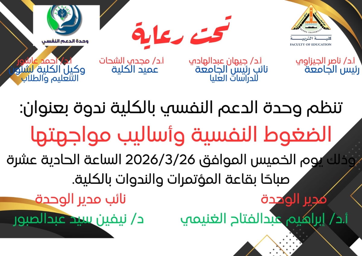 تتشرف وحدة الدعم النفسي بكلية التربية – جامعة بنها بدعوة طلاب الكلية لحضور الندوة التوعوية بعنوان: